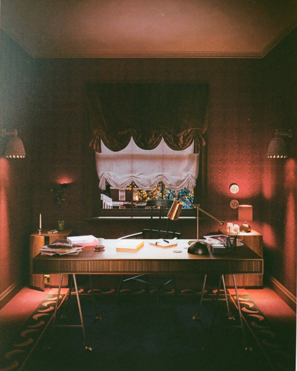 A richly, layered and textural study designed to host some of the finest UK craftmanship. Natural leather floors, a leather topped desk and silk moire walls create a space to hide away in night and day.