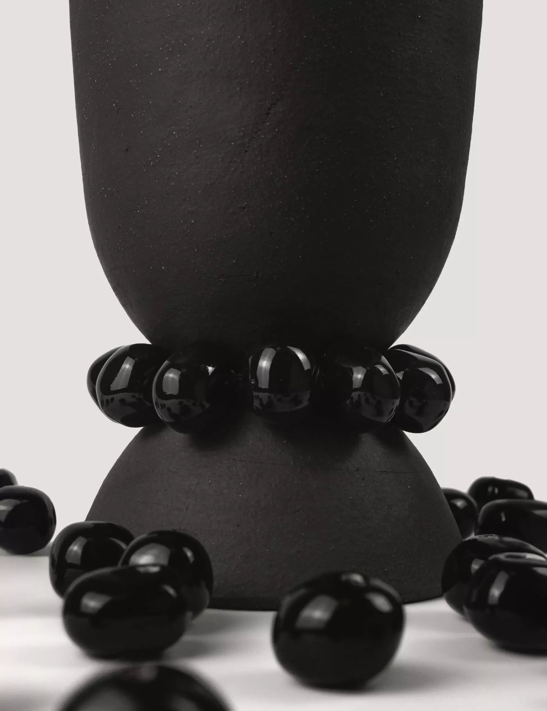 Black beaded bracelet on a black vase  with scattered beads on a light background, available  to buy on the-salon.com. SALON curates the finest , unique, handmade pieces from the interior industry's best makers and brands. Shop luxury furniture, lighting, rugs, art, antiques and vintage pieces and accessories from SALON interior designed rooms.